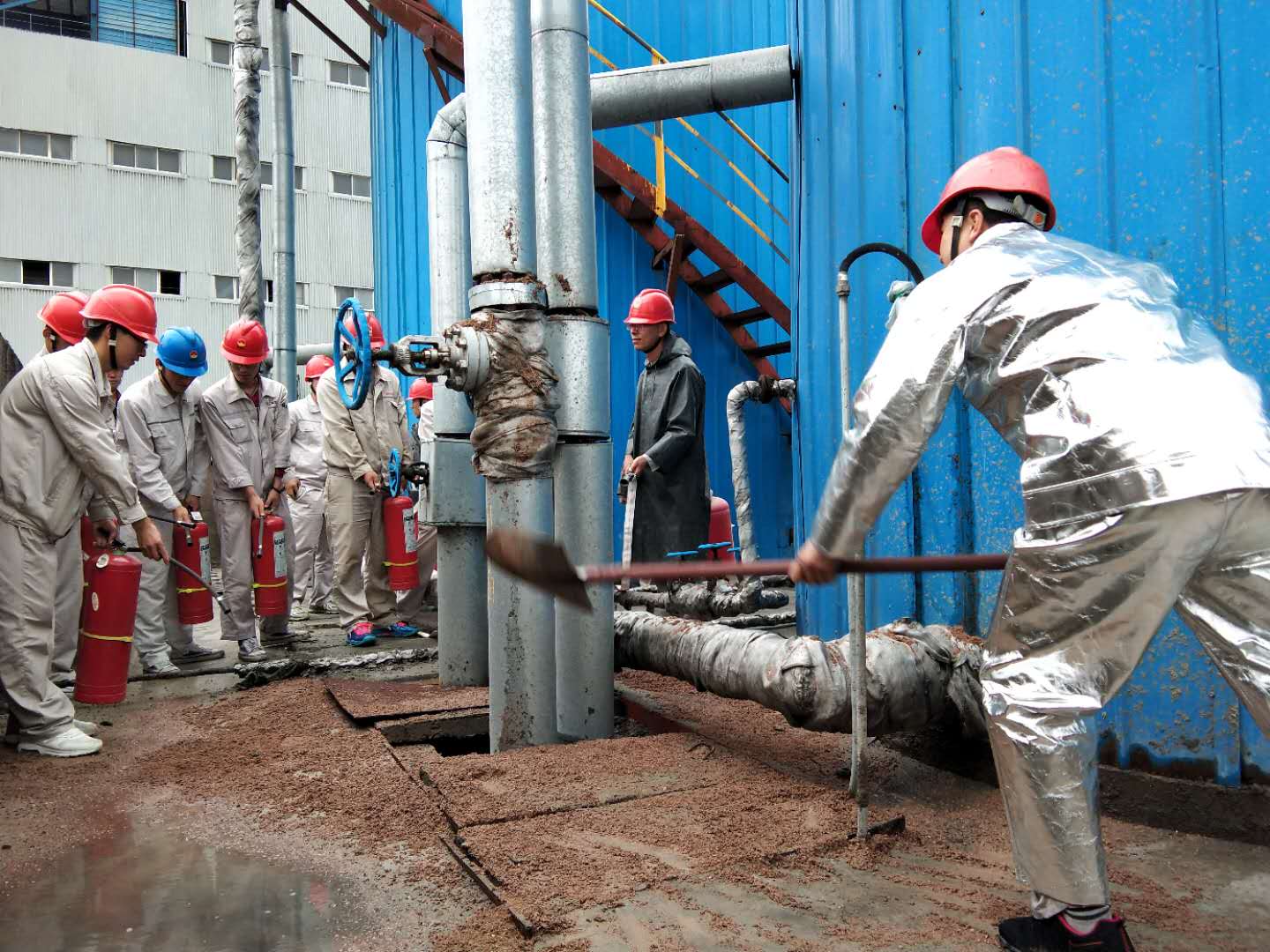 演練是以2#油罐回油管閥門前法蘭漏油,造成回油閥下方回油管道保溫棉浸油,導(dǎo)流溝內(nèi)少量積油,遇高溫引起火災(zāi)的模擬情景演練。演練過程中,各職能機(jī)構(gòu)按照預(yù)案要求及時、有序、緊密配合,堅持“把演練當(dāng)作實(shí)戰(zhàn)”,使事故得到有效控制,及時撲滅火情,避免災(zāi)害的擴(kuò)大,應(yīng)急狀況消除。
