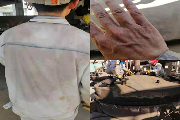 大家都知道轉(zhuǎn)化現(xiàn)場溫度很高,而且近期外界氣溫已高達(dá)三十七八度。轉(zhuǎn)化現(xiàn)場溫度都接近于45度左右,如同一個大蒸籠,而轉(zhuǎn)化人員卻每天都在這個大蒸籠里工作;每每投甩完一臺轉(zhuǎn)化器后,衣服已全部被汗水浸透;到汗珠流到眼睛后,加之與氯化氫氣體接觸,眼睛完全睜不開;在拿掉塑膠手套的那一刻,一雙手被捂的發(fā)白發(fā)皺;如同在水里浸泡了數(shù)小時一樣,但是就在這樣的工作環(huán)境下,卻沒有一個人退縮,都在堅守著自己的工作崗位,做出最大的奉獻(xiàn)。