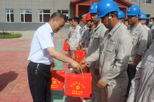 7月8日上午,固原市總工會(huì)常務(wù)副主席王志賢、開(kāi)發(fā)區(qū)總工會(huì)常務(wù)副主席羅天、開(kāi)發(fā)區(qū)管委會(huì)規(guī)劃建設(shè)局副局長(zhǎng)海濱一行,蒞臨寧夏金昱元化工集團(tuán)股份有限公司固原片區(qū),為堅(jiān)守在生產(chǎn)一線(xiàn)的員工送來(lái)防暑降溫用品。