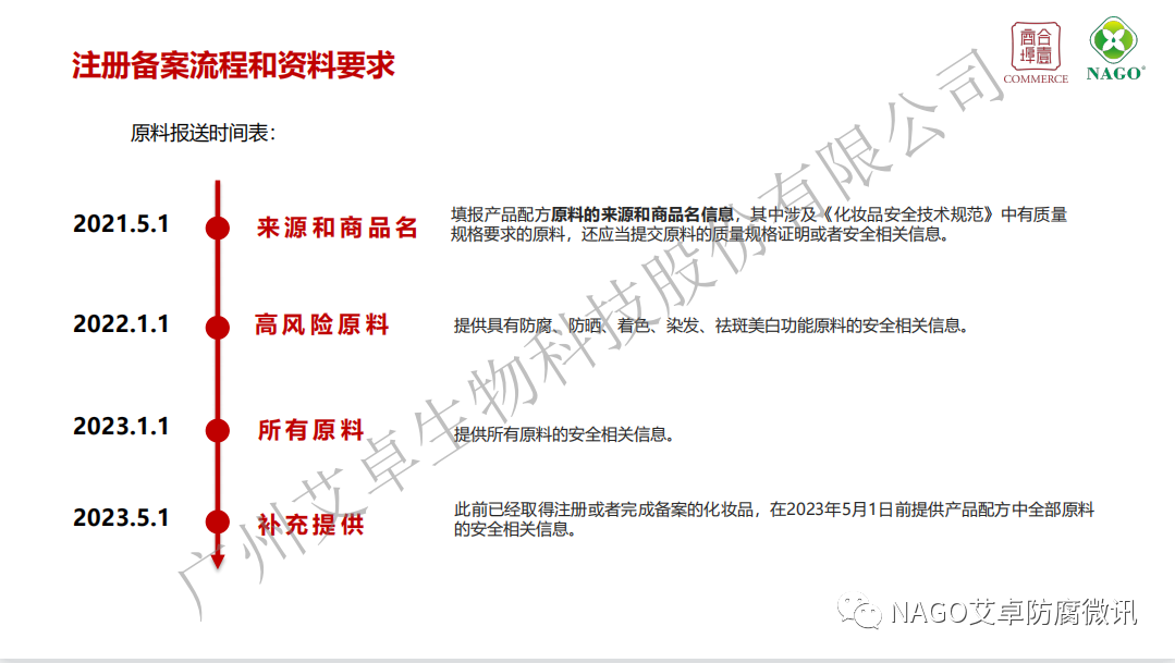 (2)自2022年1月1日起,注冊(cè)人備案人申請(qǐng)注冊(cè)或者進(jìn)行備案時(shí),應(yīng)當(dāng)按照《規(guī)定》的要求,提供具有防腐、防曬、著色、染發(fā)、祛斑美白功能原料的安全相關(guān)信息。