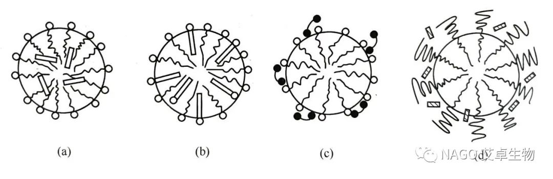 聚氧乙烯鏈間的增溶:以聚氧乙烯基為親水基團(tuán)的非離子表面活性劑,通常被增溶物包藏在膠束外層的聚氧乙烯鏈中,如圖1(d)所示