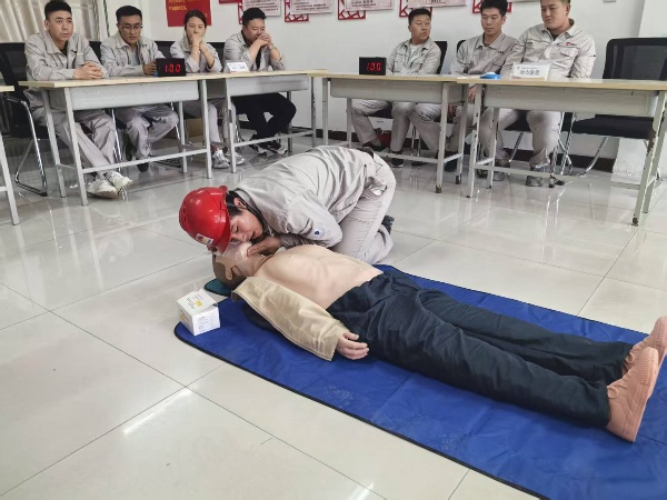 比賽現(xiàn)場,參賽隊(duì)員們個(gè)個(gè)精神抖擻、斗志昂揚(yáng)!靶姆螐(fù)蘇操作”“正壓式空氣呼吸器穿戴”兩個(gè)項(xiàng)目,選手們爭分奪秒?yún)s有條不紊:檢查患者意識(shí)和呼吸、檢查氣瓶壓力、調(diào)整背帶松緊、佩戴面罩并測試氣密性……一套流程行云流水,展現(xiàn)出扎實(shí)的技能功底與高度的安全意識(shí);顒(dòng)現(xiàn)場,公司安全總監(jiān)鐵旭東、安全主管何寧、海什全程監(jiān)督評(píng)分,并針對(duì)操作細(xì)節(jié)進(jìn)行實(shí)時(shí)監(jiān)控,將比賽轉(zhuǎn)化為安全培訓(xùn)課堂,達(dá)到競賽和培訓(xùn)相結(jié)合。參賽職工紛紛表示,通過比武不僅提升了應(yīng)急處置能力,更深刻體會(huì)到規(guī)范操作的重要性。
