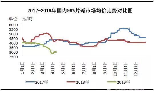 圖1 2017-2019年國內(nèi)99%片堿市場均價(jià)走勢對比