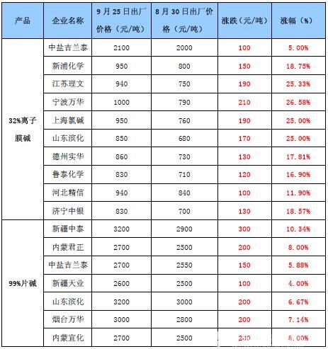從表1來看,國內(nèi)主要燒堿廠家紛紛上調(diào)出廠報價,其中中鹽吉蘭泰等廠家曾在一個交易日內(nèi)兩度上調(diào)報價,心態(tài)強烈可見一斑。在開工基本穩(wěn)定、市場供應(yīng)充足的背景下,廠家之所以迅猛上調(diào)出廠報價,主要是受江蘇;方\消息影響。自9月20日起,江蘇地區(qū)禁運危險品,在無法就地處理燒堿副產(chǎn)品液氯的情況下,當?shù)夭糠譄龎A企業(yè)只能選擇降負荷或停工,燒堿供應(yīng)預(yù)期大幅減少。因此,江浙一帶燒堿企業(yè)惜售心態(tài)強烈,自9月初開始,大幅輪番上調(diào)出廠報價,其中漲幅最大的要數(shù)寧波萬華。