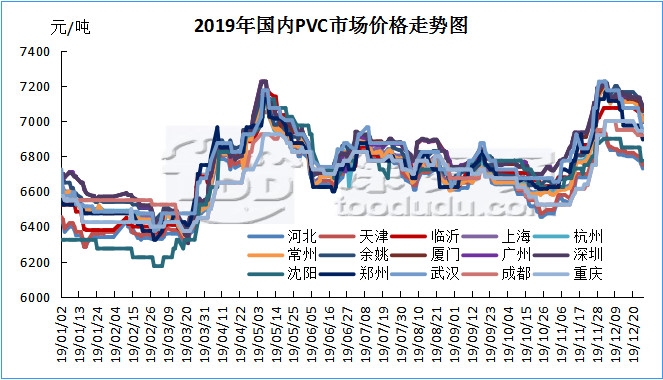 2019年中國(guó)國(guó)內(nèi)PVC市場(chǎng)仍舊是價(jià)格高位整理的一年,全年價(jià)格波動(dòng)區(qū)間以華東主流為例在6440-7225元/噸之間,高低價(jià)差785元,從走勢(shì)圖以及月均價(jià)走勢(shì)可以看出,2019全年經(jīng)歷兩撥較大幅度的推漲,其中第一季度1-3月份市場(chǎng)較為低迷,處于低谷整理期,4月份開(kāi)始市場(chǎng)價(jià)格開(kāi)始緩慢上漲,經(jīng)歷不斷的上漲價(jià)格在5月中旬開(kāi)始達(dá)到年內(nèi)第一次高點(diǎn),價(jià)格達(dá)到高點(diǎn)后,需方承受能力有限,價(jià)格開(kāi)始下行,下行至6月中下旬后,市場(chǎng)開(kāi)始進(jìn)入緩慢的整理期,長(zhǎng)達(dá)4個(gè)月,6月中下旬-10月中旬,價(jià)格一直處于小幅震蕩整理中,供需雙方的博弈一度令PVC整體產(chǎn)業(yè)鏈進(jìn)入迷茫期,多數(shù)行業(yè)內(nèi)人士甚至認(rèn)為PVC產(chǎn)品的下跌大周期開(kāi)始來(lái)臨,我們回顧下往年的PVC行情,其價(jià)格在15年5月初達(dá)到最低點(diǎn)后內(nèi)蒙出廠4350元/噸含稅,價(jià)格在歷史低點(diǎn)后開(kāi)始不斷反彈,在經(jīng)歷了16-18年的整理后,在19年中國(guó)國(guó)內(nèi)PVC市場(chǎng)仍占據(jù)高點(diǎn),四年間PVC生產(chǎn)企業(yè)賺的盆滿缽滿。但下游制品企業(yè)卻苦不堪言,并且自18年國(guó)家稅控改革以來(lái),次終端貿(mào)易商對(duì)稅票逐漸失去控制,導(dǎo)致次終端利潤(rùn)不斷下滑,規(guī)范的市場(chǎng)導(dǎo)致票貨分離減少。而在整個(gè)PVC產(chǎn)業(yè)鏈中,生產(chǎn)企業(yè)占據(jù)越來(lái)越多的話語(yǔ)權(quán),從而導(dǎo)致了雖然我們看到在迷茫期過(guò)后,第四季度國(guó)內(nèi)PVC市場(chǎng)仍舊迎來(lái)年底第二次大漲,此次上漲把PVC價(jià)格推上了真正的年底高點(diǎn)。第四季度的上漲導(dǎo)火線為內(nèi)蒙企業(yè)裝置出現(xiàn)意外事件停產(chǎn),市場(chǎng)炒作聲漸起,價(jià)格開(kāi)始上漲,而隨后的11-12月份,在期貨的帶動(dòng)下,價(jià)格不斷被推上新高。12月中旬需方面對(duì)如此高的價(jià)格開(kāi)始產(chǎn)生抵觸心理。而此時(shí)的年度備貨來(lái)臨,市場(chǎng)不但沒(méi)有復(fù)漲反而開(kāi)始進(jìn)入蕭條期,價(jià)格開(kāi)始下滑。