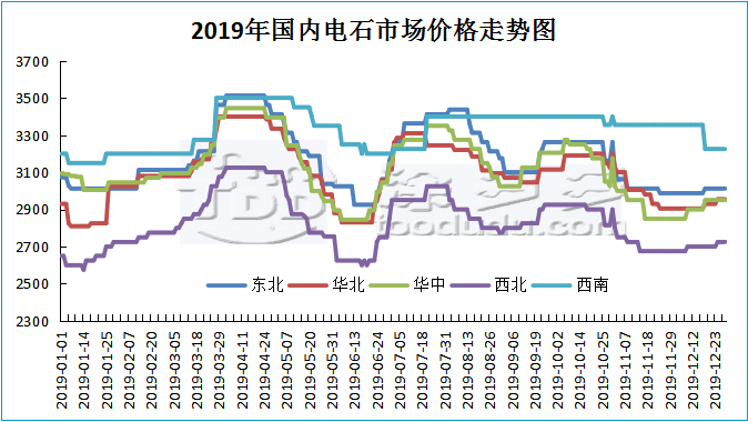 2019年中國(guó)國(guó)內(nèi)電石走勢(shì)上半年跟隨PVC走勢(shì)類(lèi)似,第一季度震蕩上行整理,4月份到達(dá)年度高點(diǎn),但隨后價(jià)格開(kāi)始下行,下行至6月中旬又開(kāi)始震蕩上漲,隨后的三四季度震蕩走低中。整體來(lái)看作為PVC上游原料,電石的走勢(shì)類(lèi)似于PVC走勢(shì),但并不完全相同,尤其下半年,我們可以推測(cè),下面的PVC收到資金以及市場(chǎng)炒作以及期貨方面的影響較大,并不是從供需、原料方面受到影響。