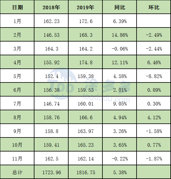 2019年1-11月PVC累計(jì)產(chǎn)量1816.75萬(wàn)噸,同比去年減少92.79噸。漲幅5.38%,產(chǎn)能的凈增是產(chǎn)量增加的主要原因。