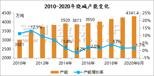 2016年在大宗原料價格開啟上漲通道后,中國燒堿產(chǎn)能增長率轉(zhuǎn)負(fù)為正。2020年6月末百川盈孚統(tǒng)計中國燒堿產(chǎn)能約4341.4萬噸。( 2015年大宗商品交易平臺價格的處于歷史最低水平,供給側(cè)改革降低了大宗商品交易平臺供給的彈性,使得價格暴漲成為可能)。